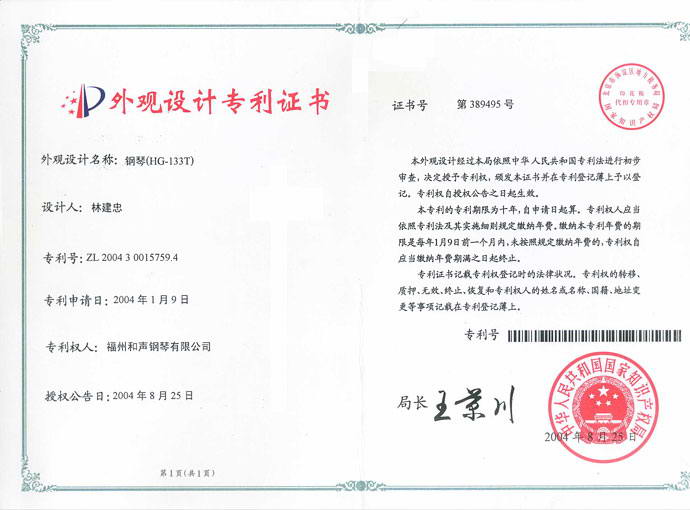 HG-133T型;该琴的外观设计简洁大方,米字形琴背架受力结构合理,为国内首创。
