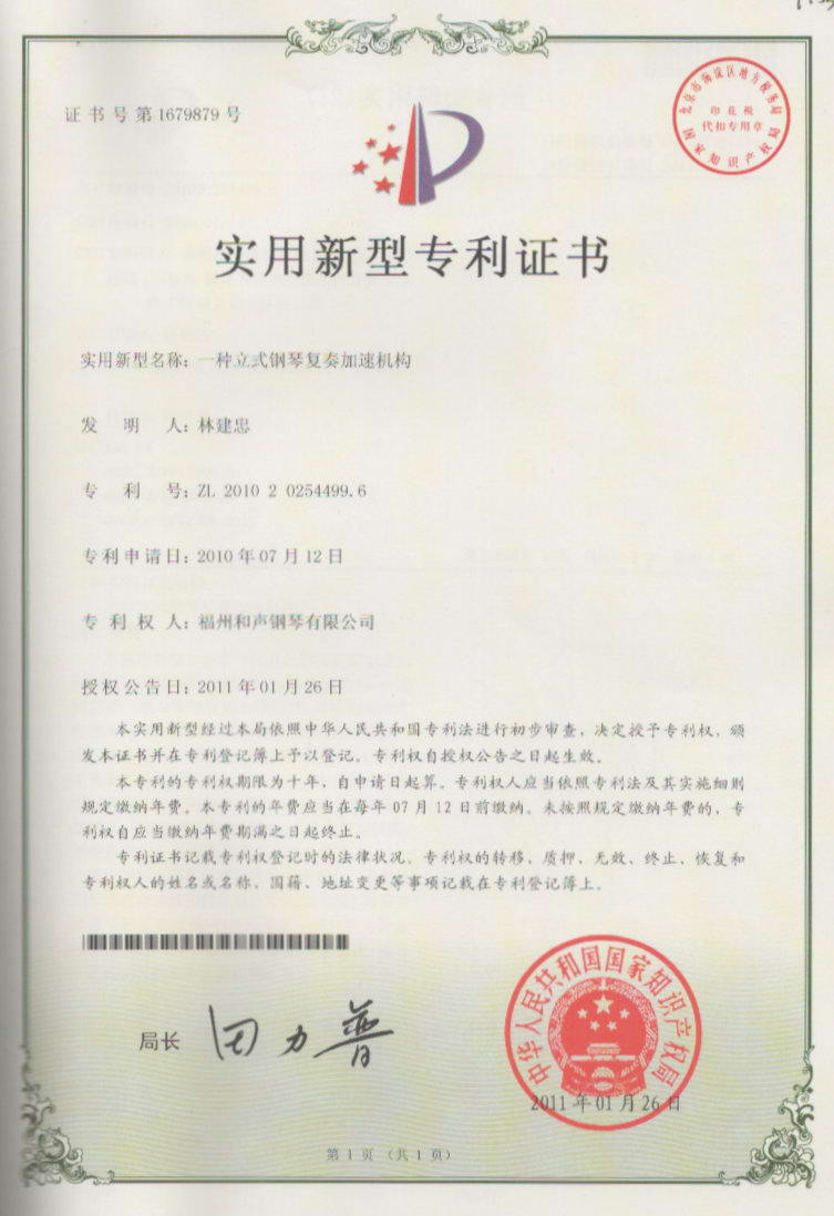 一种立式钢琴复奏加速机构(实用新型专利,专利号:ZL 2010 2 0254499.6) 2018-06-28 09:58:40