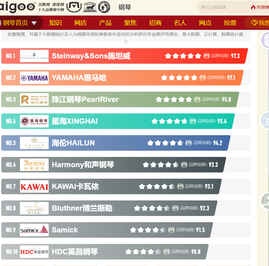 钢琴品牌排行榜CN10/CNPP品牌数据研究部门,是一家历史悠久且权威公正、公平的测评机构。前期通过资料收集整理,并基于大数据统计及人为根据市场和参数条件变化分析研究而得出的结果。同时以企业实力、创新能力、品牌荣誉、网络投票、网民口碑打分,企业在行业内的排名情况,企业获得的荣誉及奖励情况等为基础。通过计算机分析模型对广泛的数据资源进行采集分析研究,综合了多家机构媒体和网站排行数据,原始数据来源于信用指数以及几十项数据统计计算,系统生成的品牌企业行业大数据库,并由研究人员严格审核市场和参数条件变化后最终形成十大数据。